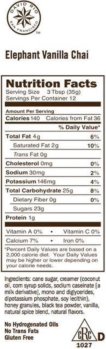 | Ingrediënten | cane sugar, creamer (coconut oil, corn syrup solids, sodium caseinate [a milk derivative], mono and diglycerides, dipotassium phosphate, soy lecithin), honey granules, black tea powder, vanilla, natural spice blend, natural flavors. |