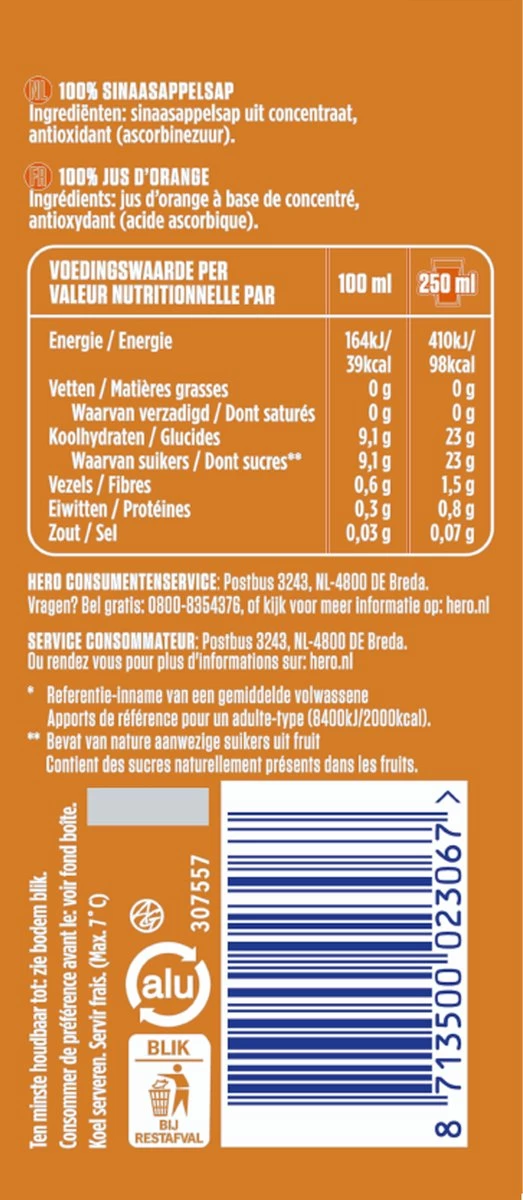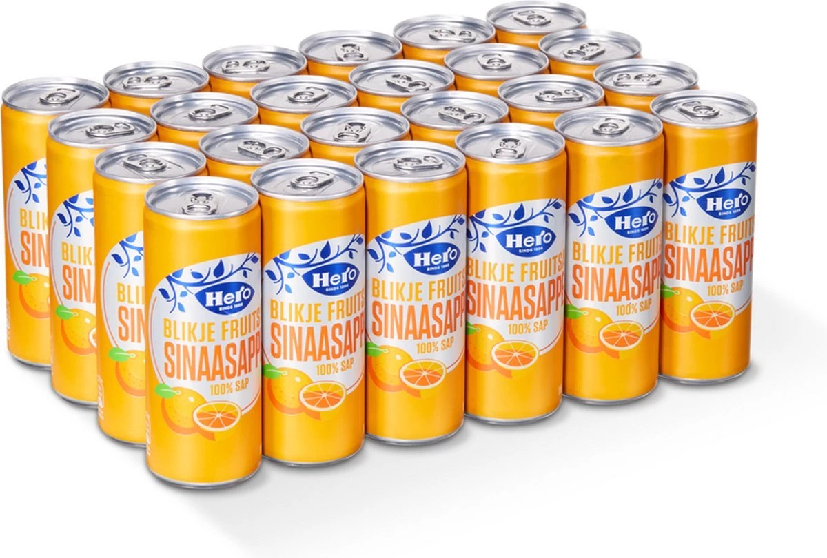 Deze tray bevat 24 blikjes Hero sinaasappelsap, met een inhoud van 250 ml per frisdrank blikje.