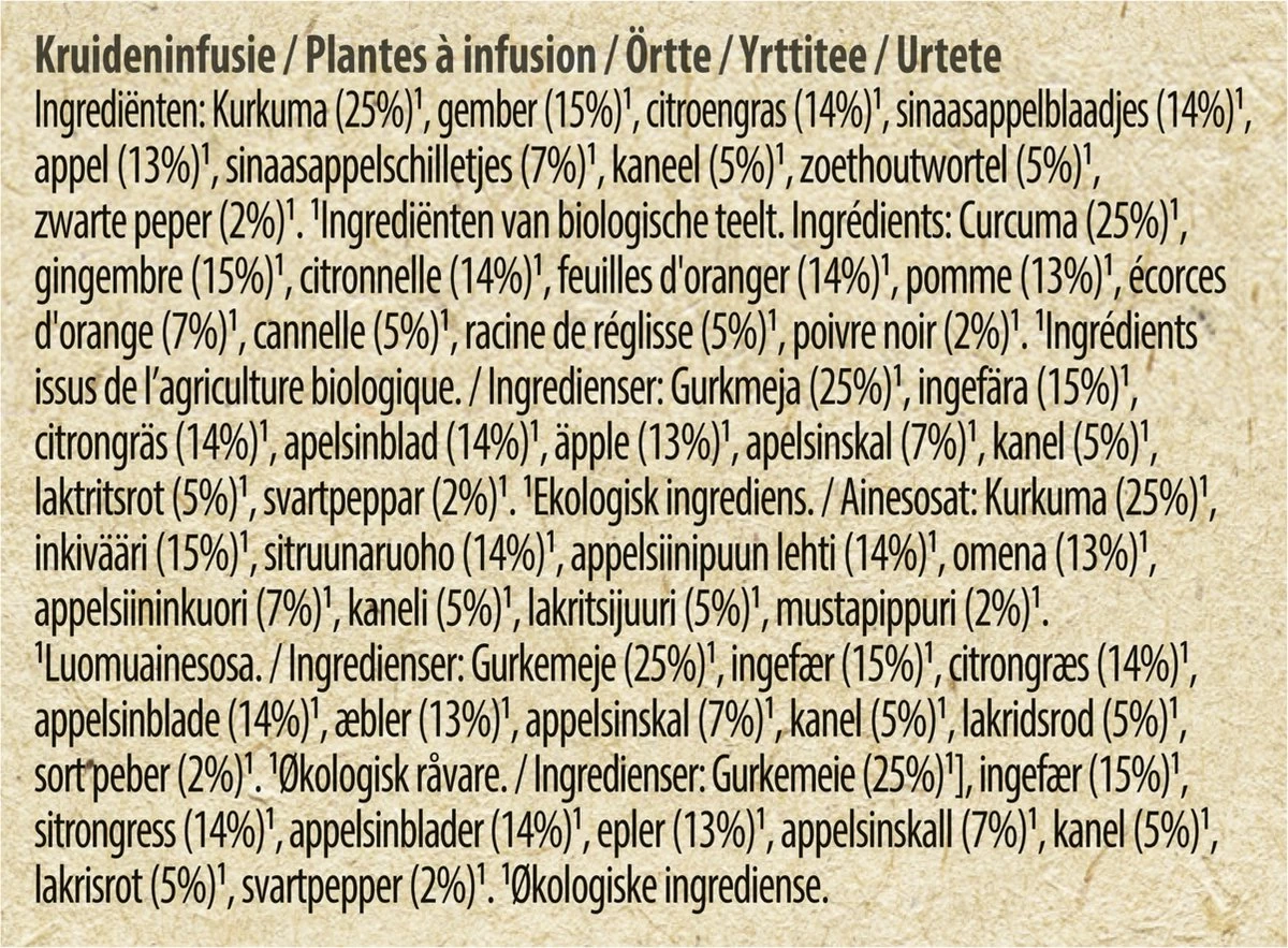 - Een biologische kruidenthee met de krachtige smaak van gember en kurkuma