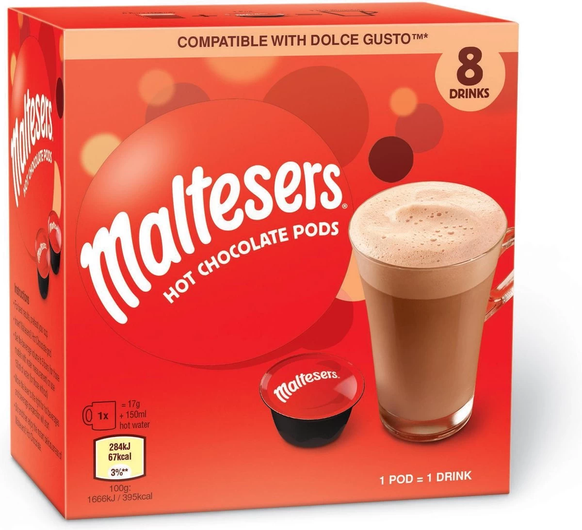 Maltesers Warme Chocoladedrank cups zijn geschikt voor Dolce Gusto machines. U kunt nu heerlijke warme chocoladedrank maken met de smaak van Maltesers.