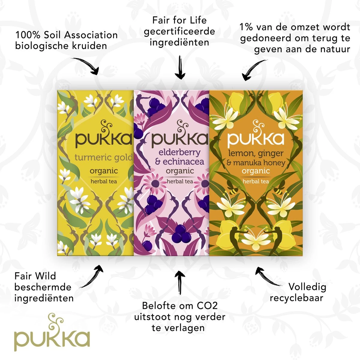 Al onze producten worden gemaakt met gebruik van hernieuwbare energie, we zijn een gecertificeerde B Corp organisatie. Pukka is bovendien aangesloten bij 1% for the Planet en doneert jaarlijks 1% van haar omzet om milieuprojecten over de hele wereld te ondersteunen. Pukka is daarnaast Fair for Life en FairWild gecertificeerd. Deze bundel is het perfecte cadeau voor theeliefhebbers die graag gezond leven en verantwoord met de planeet willen omgaan. Deze biologische thee is ook ideaal om jezelf mee te verwennen.