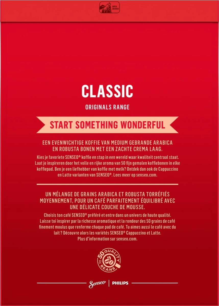 Een evenwichtige koffie van medium gebrande Arabica- en Robustabonen voor een rijke smaak, met een heerlijke crema laag. Geniet met één druk op de knop van een vers kopje Senseo® Classic koffie.