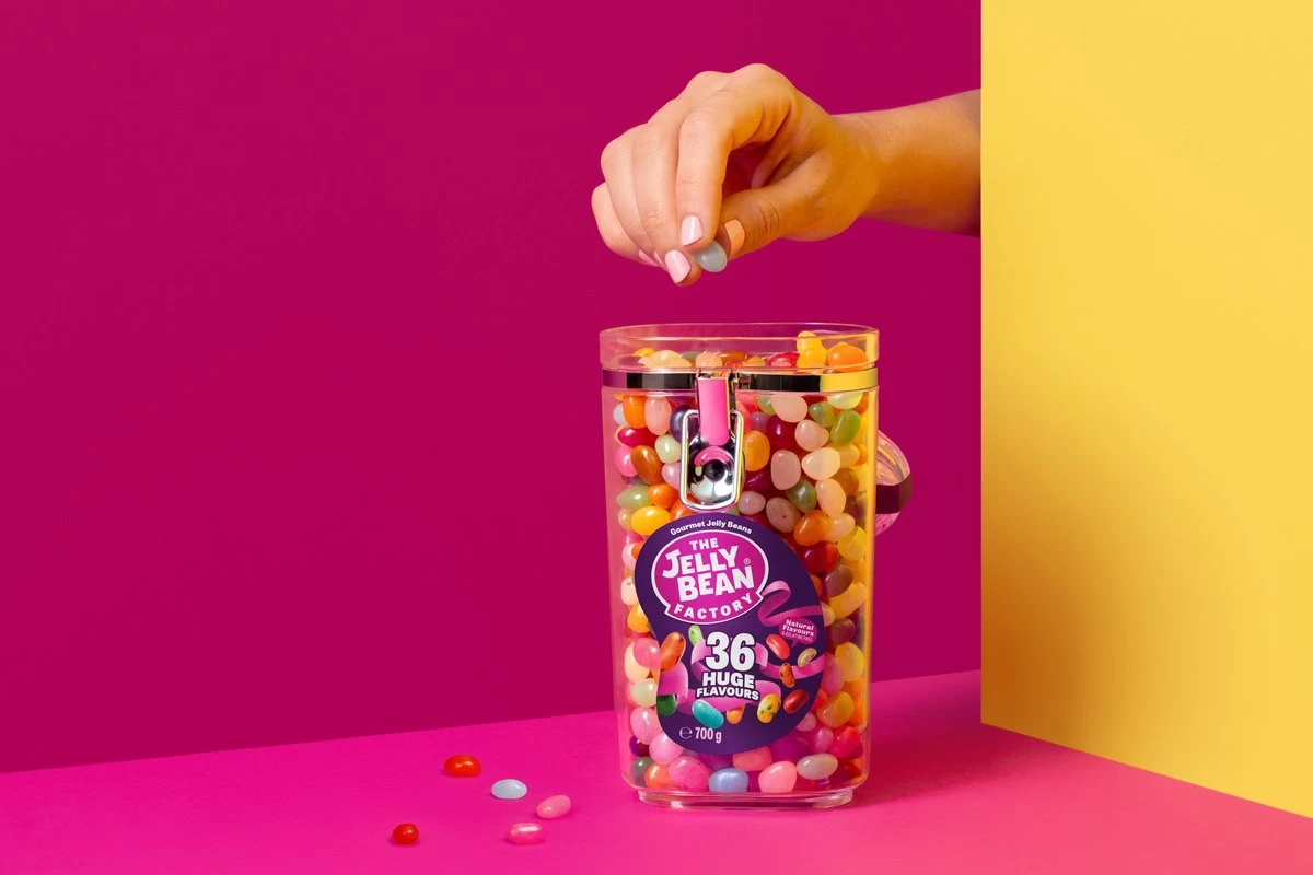 Jelly beans van The Jelly Bean Factory in 36 verschillende en unieke smaken, met een knapperige buitenkant en een heerlijk zachte binnenkant. Nu beschikbaar in een luxe glazen verpakking. Handig voor in de voorraadkast of om cadeau te geven. Geniet van heerlijke jelly beans tijdens een film op de bank, onderweg in de auto, of op een verjaardag.