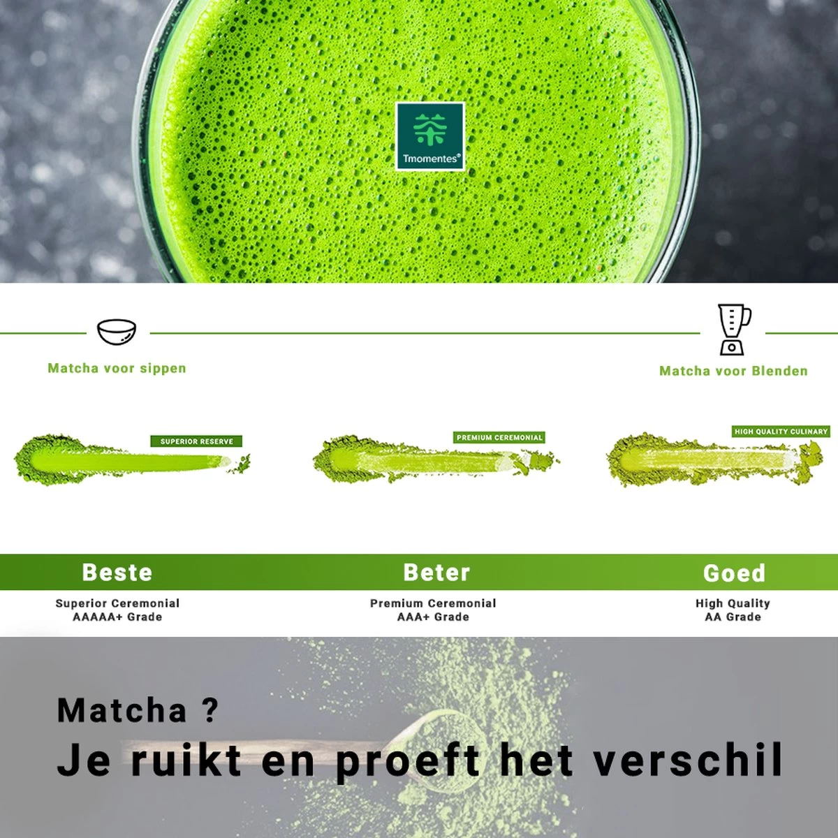 - SUPERIOR CEREMONIAL PREMIUM MATCHA thee – Allerhoogste kwaliteit matcha – Zijde zacht schuim – Prachtige vol zoete smaak – 30 gram – AAAAA+ Gradering – https://www.bol.com/nl/nl/p/tmomentes-superior-ceremonial-premium-matcha-thee-allerhoogste-kwaliteit-matcha-zijde-zacht-schuim-prachtige-vol-zoete-smaak-matcha-poeder-matcha-thee-100-organisch-gecertificeerd-30-gram-aaaaa-gradering/9300000079976646/