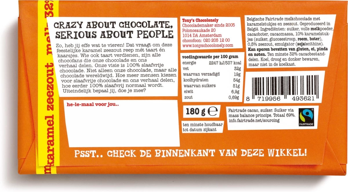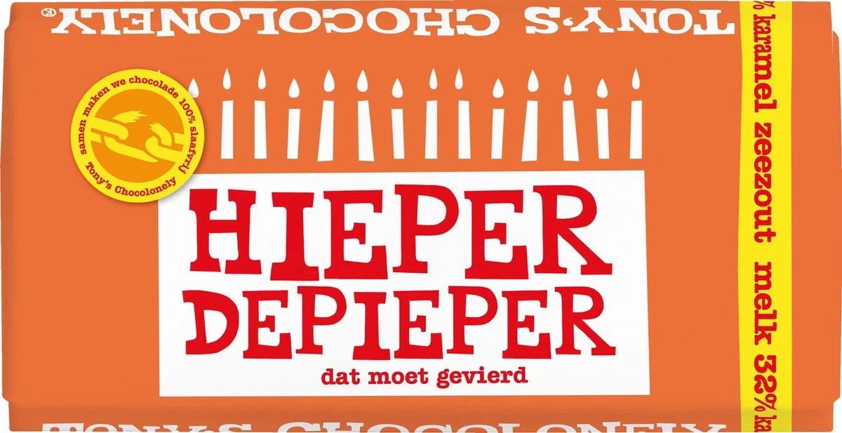 Wat je ook te zeggen hebt, je zegt ’t vanaf nu met een reep. Da’s beter dan een mond vol woorden. Stuur de hieper de pieper-reep naar je neefje omdat ’ie z’n zwemdiploma heeft gehaald of naar je oma omdat ze iets te vieren heeft. Want dat vraagt om deze feestelijke karamel zeezout reep mét taart én kaarsjes. Voor het zélf maken van je eigen unieke wikkel ga je naar: tonyschocolonely.nl