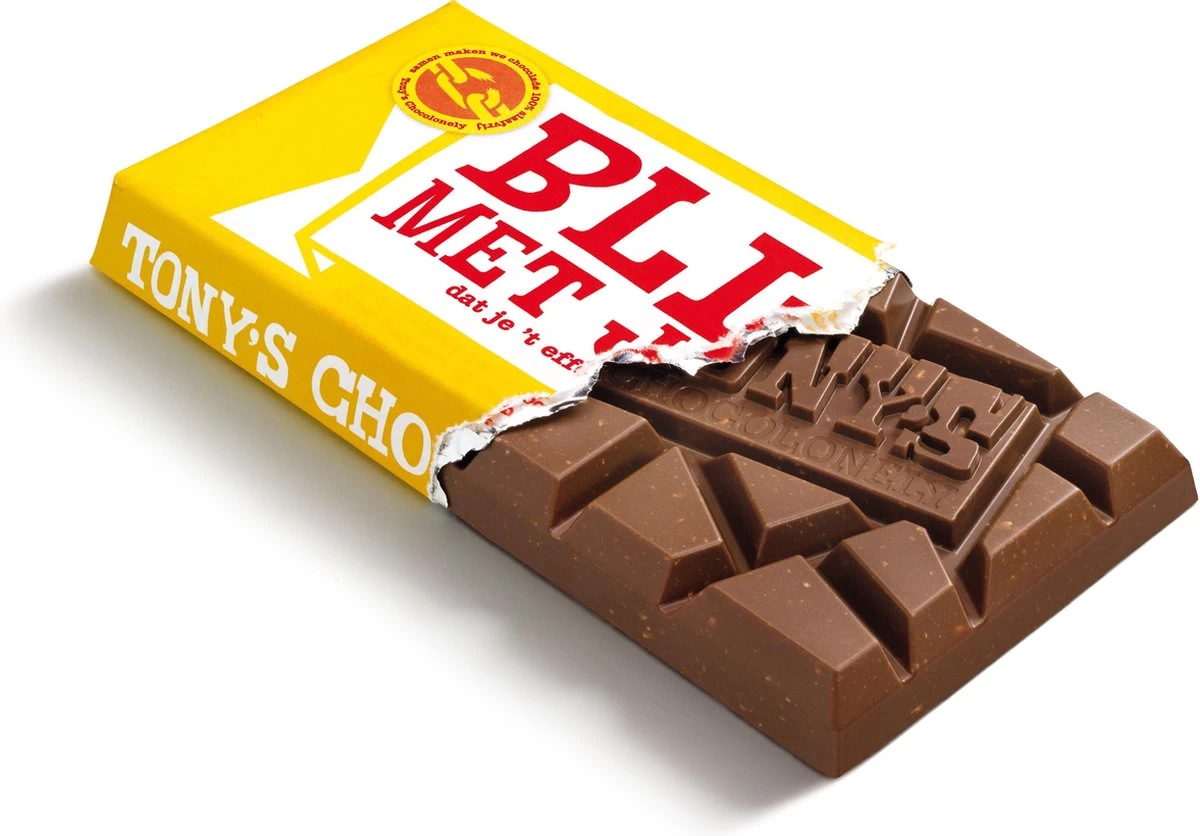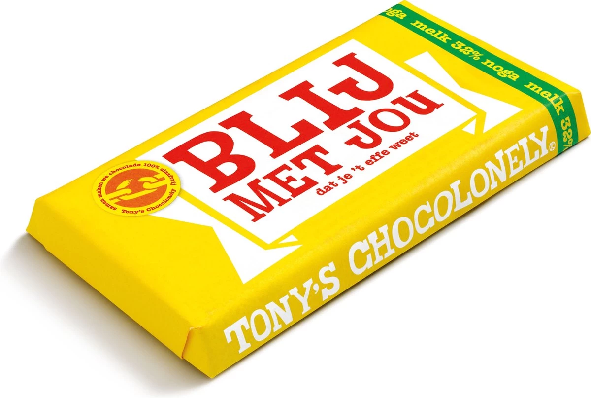 Wat je ook te zeggen hebt, je zegt ’t vanaf nu met een reep. Da’s beter dan een mond vol woorden. Zeg je lover, je bestie of nieuwe collega hoe blij je wel niet met ze bent met de blij met jou-reep met melkchocolade en noga. Dat ze ’t effe weten. Voor het zélf maken van je eigen unieke wikkel ga je naar: tonyschocolonely.nl